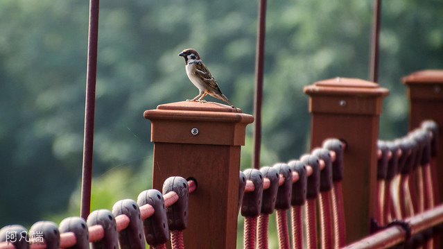 吊橋上彩繪的童趣的圖案,綠色的大樹下,停著一輛自行車,樹上還有隻啄木鳥