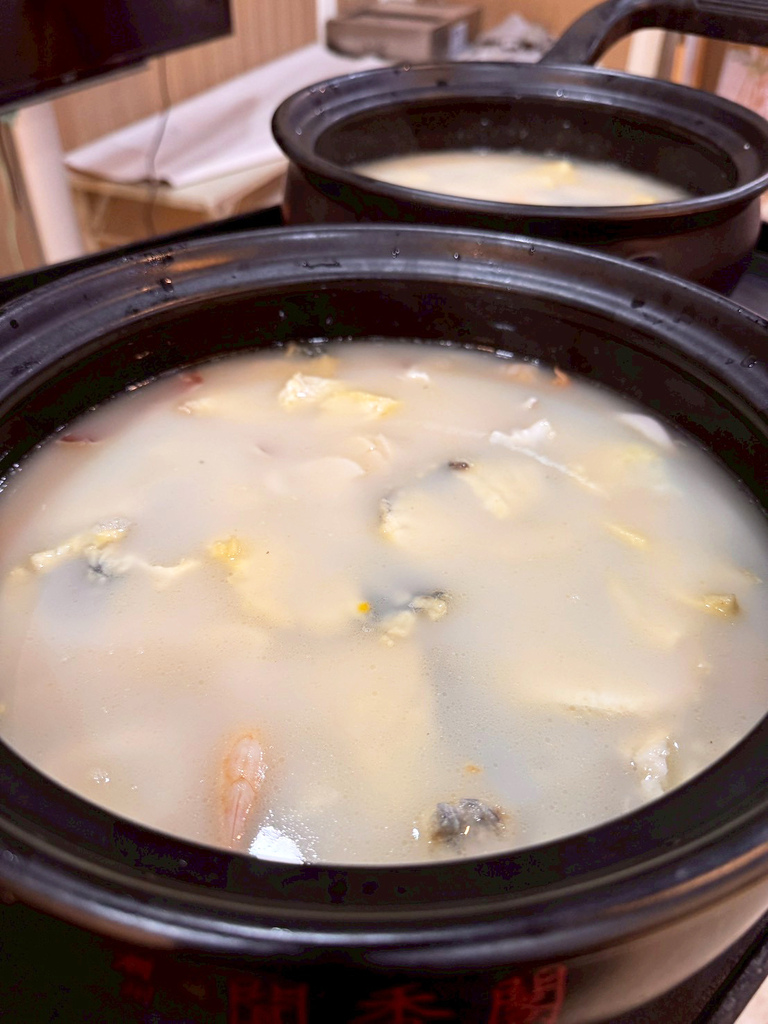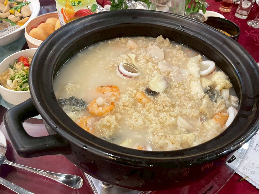 米飯吸收了湯汁後變得濕潤又軟糯,搭配新鮮的干貝、蝦仁、花枝、鱸魚等等海鮮,每一口都充滿海味,溫暖又暖心。