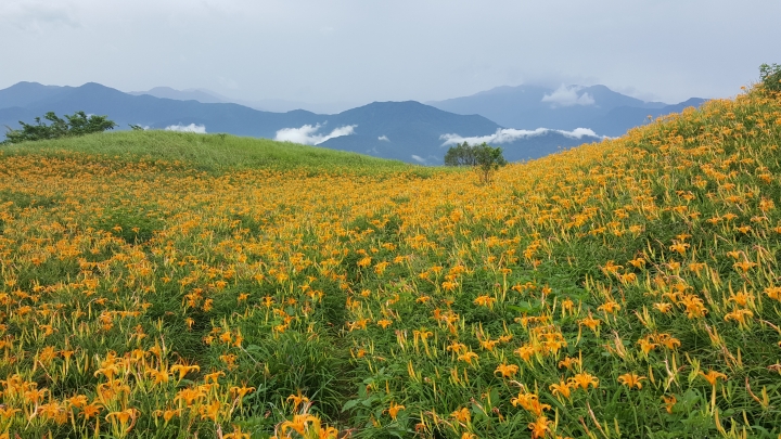 9/4早上才上六十旦山賞金針花海 在小瑞士觀景台上 聽到台東縣的志工解說員說到:因為前一周連續下雨的原因 造成金針花加速開花本來應該是正盛開的時間 卻只剩約1/3的花量 且從花包數來預估 開花數會日漸減少 僅供你參考