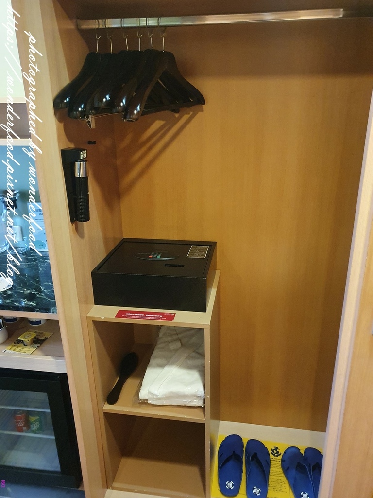 衣櫃內有穿鞋棒、浴衣、拖鞋、保險箱、手電筒和衣架