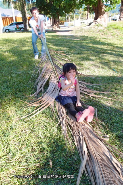 柔拔利用椰子樹的落葉就這樣一路拖著兩姊妹