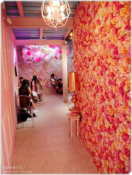 用餐區一旁也有一片粉嫩色系的玫瑰花牆,