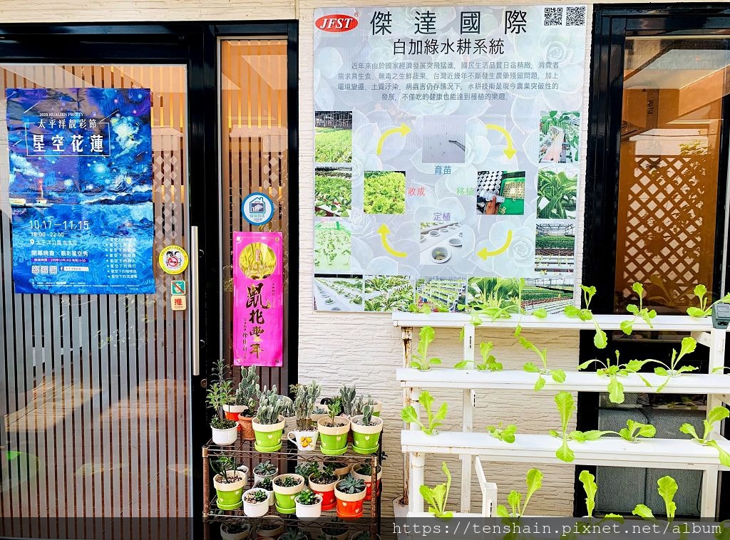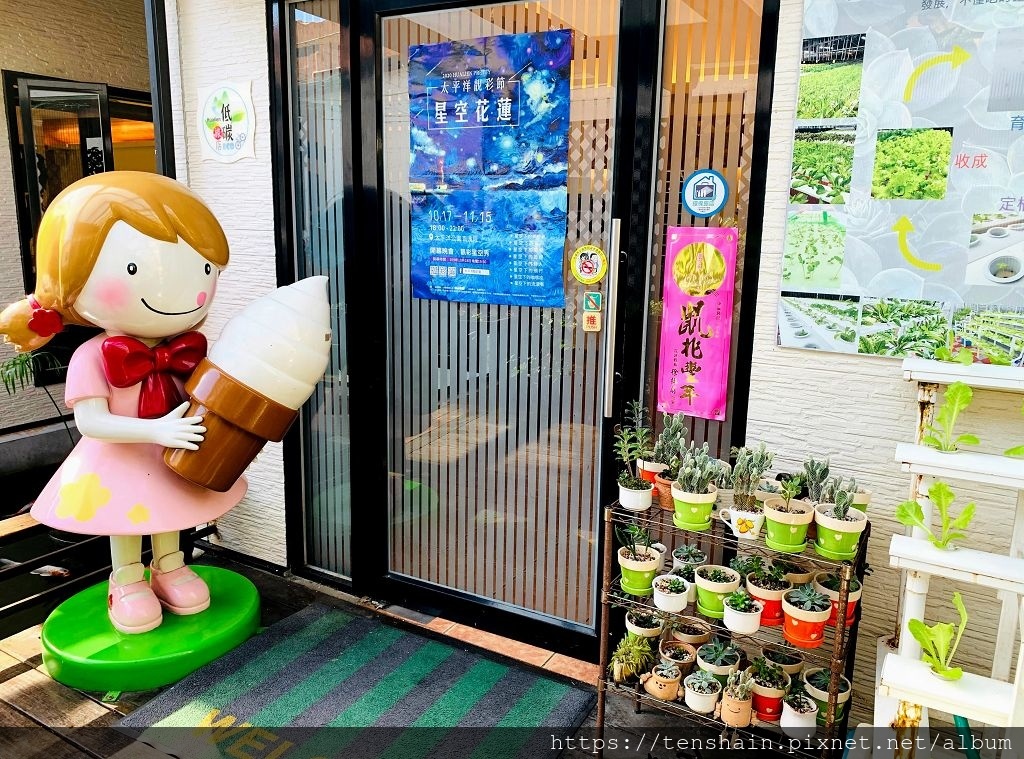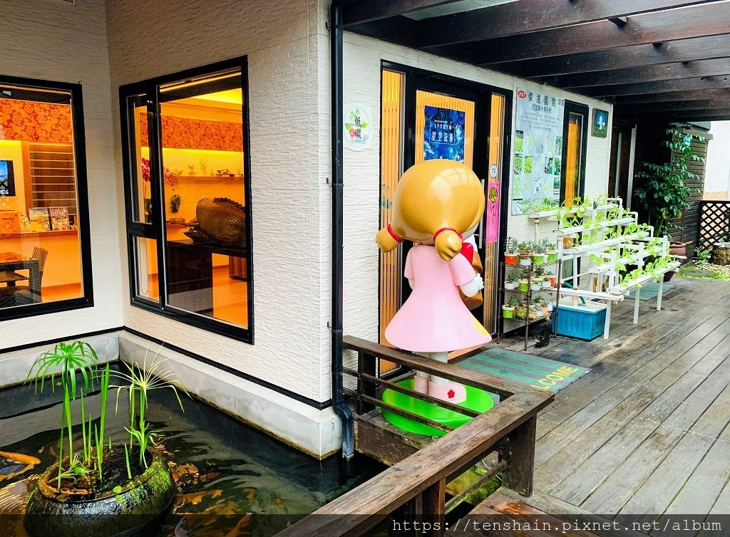 這裡就是接待中心,也是窩心生態咖啡館的大門,門邊有個很大的甜心娃娃人偶,捧著大大的冰淇淋,真可愛。管家蔡先生指著門上的海報,開心的對我們說:「你們來得正是時候,太平洋靚彩節-星空花蓮到 11/15 就結束了,晚上可以去看看,非常精彩哦!」哈哈~我們真的太幸運了!