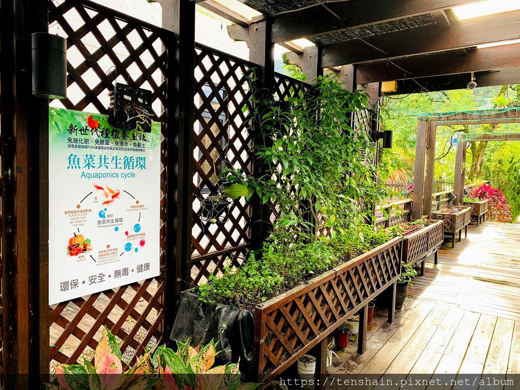 左邊是魚菜共生循環系統,這是一種結合循環水養殖與水耕的一種農魚綜合生產系統,利用硝化菌將魚的排廢物經硝化作用轉換成植物可利用的營養鹽,能降低水中對魚有毒的代謝廢物,也能提供植物生長所需的營養,因此植物和硝化菌形同過濾器,不但能去除魚的排廢物,還能淨化水質使養殖水能循環再利用。