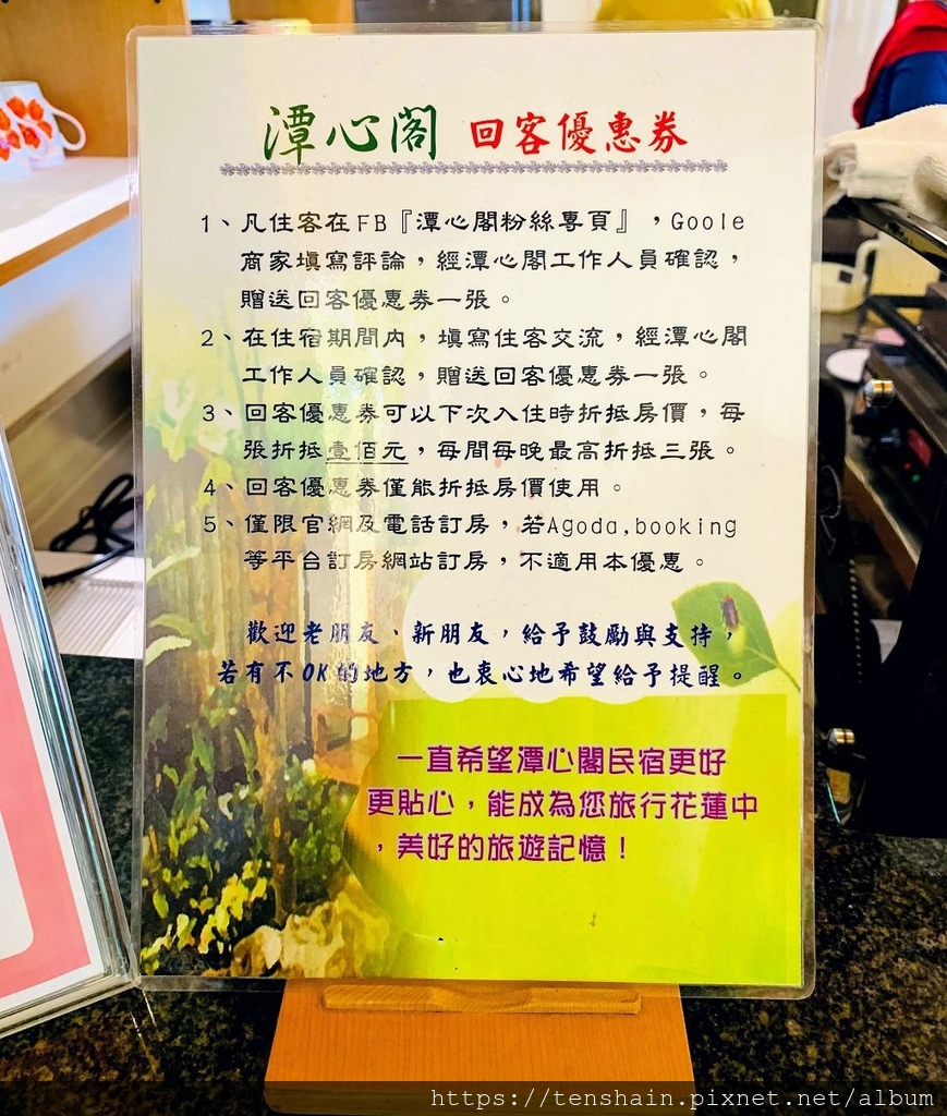 另外還有回客優惠券,這個真的有用,因為我們發現這裡的回頭客很多。你問我怎麼知道?因為晚一點我們過來吃下午茶時,以及隔天吃早餐時,發現一些客人和老板娘非常熟稔,聊得很開心。從他們聊天的內容就知道有人一年都會來好幾次,甚至還有一家人表示已經開始規劃過年要再來潭心閣的行程了。