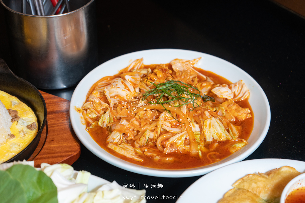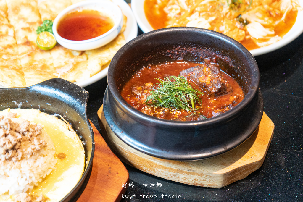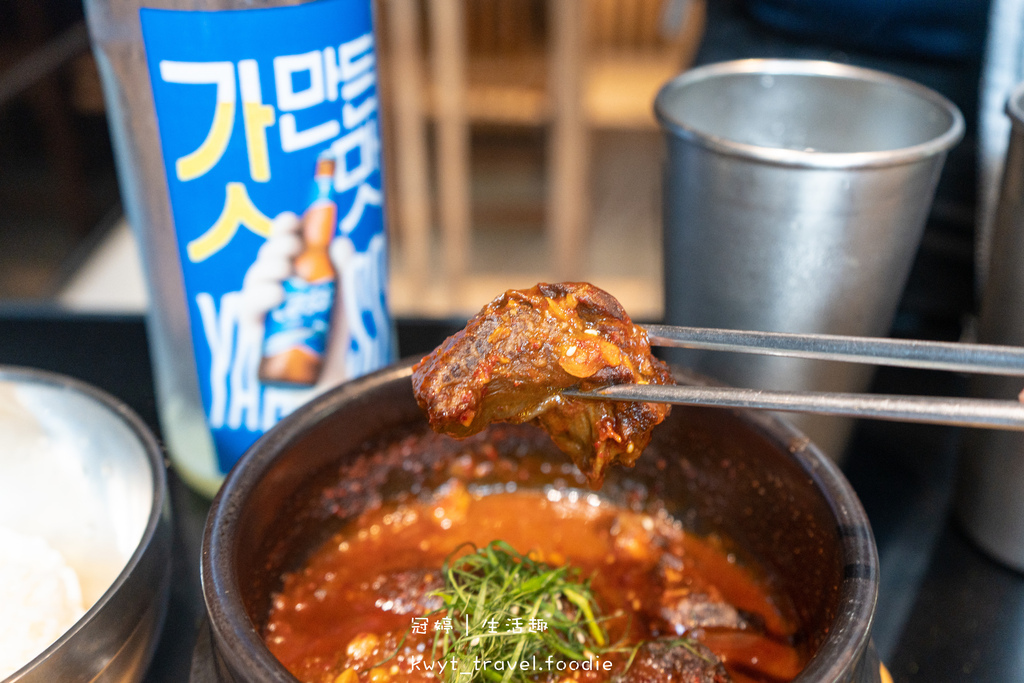 當天選擇的是辣醬風味的大邱燉牛肋,可以嚐到牛肋的肉肉口感是蠻紮實、軟嫩的,直接入口的鹹度稍微高了一些,是白飯殺手的料理之一,光是這鍋就可以嗑掉2碗飯。
