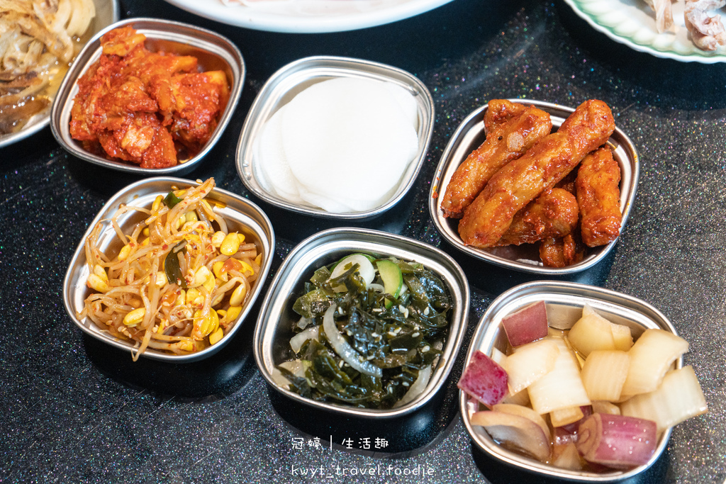 甜不辣、秘製蘿蔔、涼拌海帶芽、韓式泡菜、韓式醃洋蔥,涼拌黃豆芽