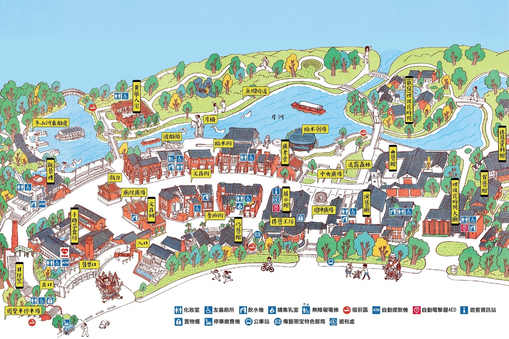 動態展示是以園區內市街聚落區以及水岸的露天舞台、田園景觀區等為主