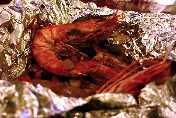 剝開鹽塊,撕開熱騰騰的鋁箔紙,原來裡面是蝦蝦呀!作工如此繁複,只希望客人嚐鮮甜。