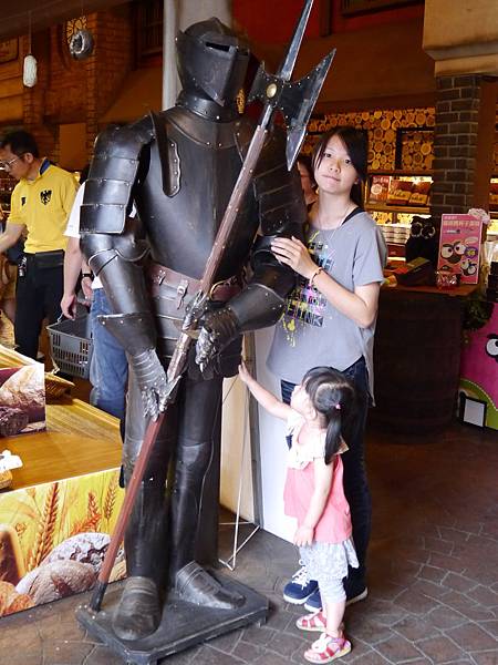 後來才知道這個新的景點跟 宜蘭窯烤山寨村 是同一個集團,難怪餐廳的動線格局有異曲同工之妙,不過這裏走的主題風格,是源自於哈利波特魔法小說的創意,門口擺著一個黑戰士,妞妞非常好奇的看東看西,東摸摸西摸摸