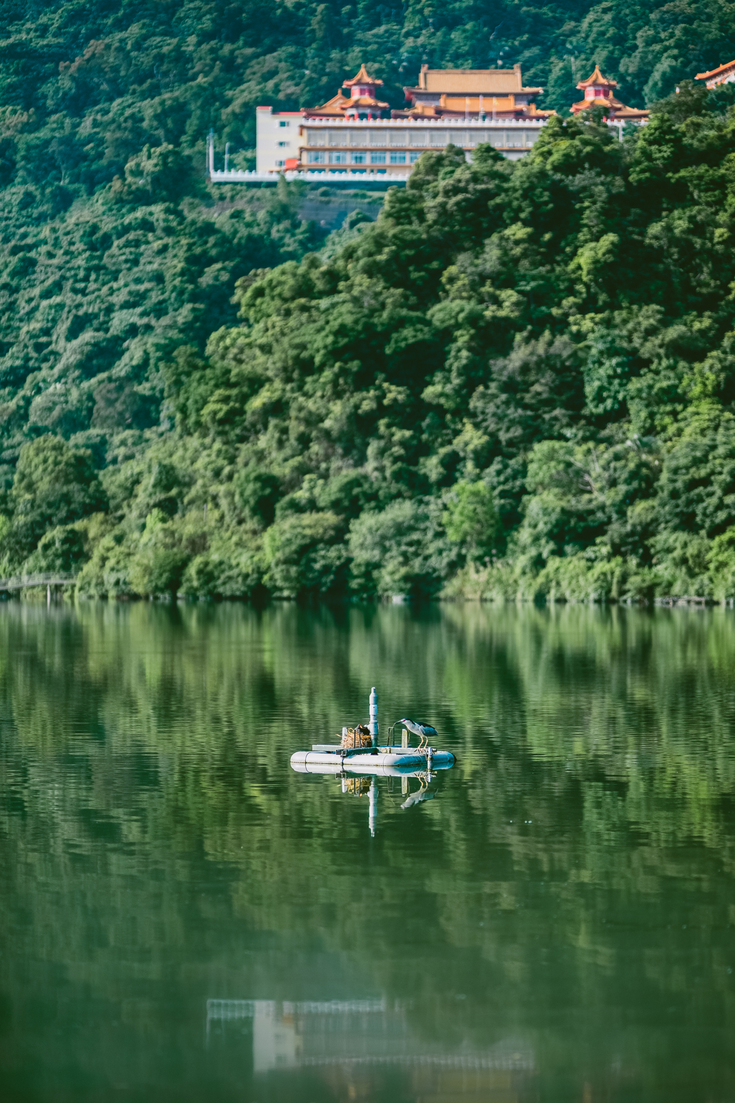 湖畔周遭都是山林環繞,此時的陽光灑落在花草樹木上,湖水如同鏡面般倒映了山巒的身影,賞心悅目。而如此幽美的自然環境,必定許多水鳥棲息活動,沿路上能見到不少種類的鳥兒優遊自在。