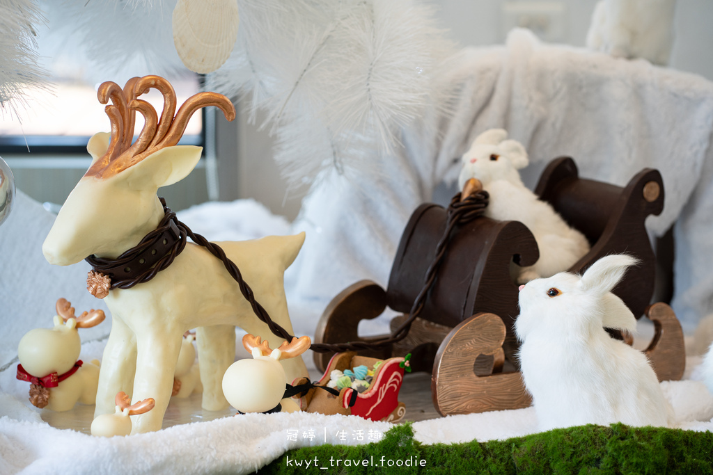 聖誕節大型裝置周邊的擺飾:拉著雪橇的麋鹿、旁邊的小麋鹿是由蘭陽烏石港海景酒店的主廚們以巧克力為主食材精心打造的,麋鹿周圍洋溢著巧克力的甜蜜氣息。