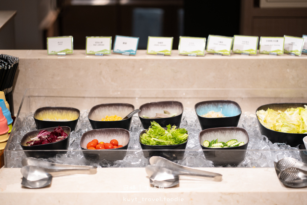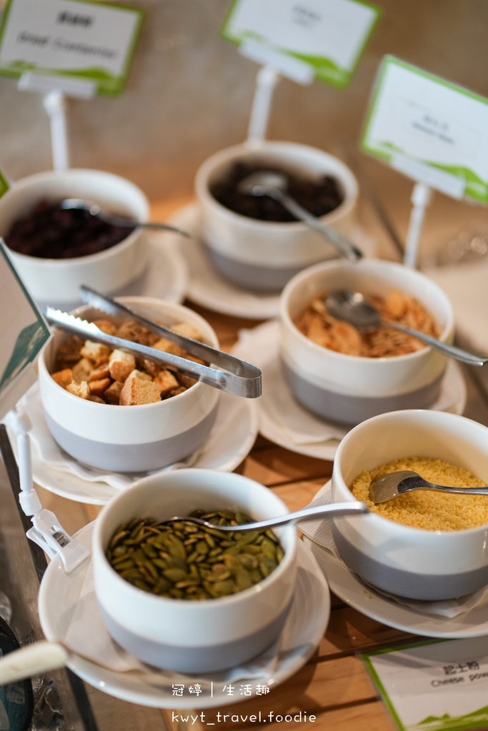 美生菜、紅包心菜、脆藻、苜蓿芽、玉米粒、小番茄、紫高麗苗、小黃瓜,可搭配百香果沙拉醬、和風醬、藍莓醬、千島醬、凱撒醬等醬料一起享用。
