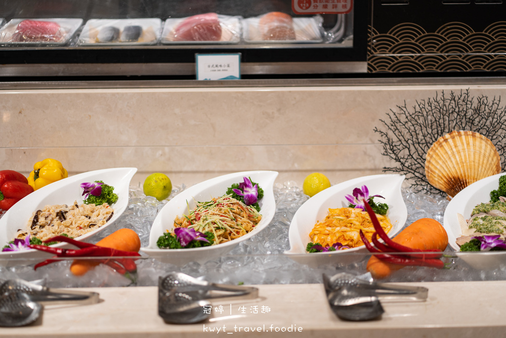 九孔鮑魚(佃煮)、中卷、熟白蝦、旭蟹,可搭配檸檬角、薑醋汁、蒜蓉醬、五味醬等一起享用,提升鮮味層次。