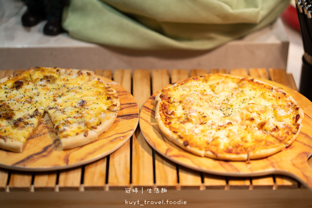 可選擇西式白醬、蘑菇紅醬、黑胡椒醬;食材有:蝴蝶麵、墨魚麵、螺旋麵、紅黃椒絲、德式香腸、海瓜子肉、小蝦仁等自行夾取給廚師烹調。