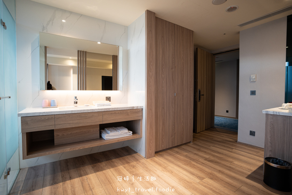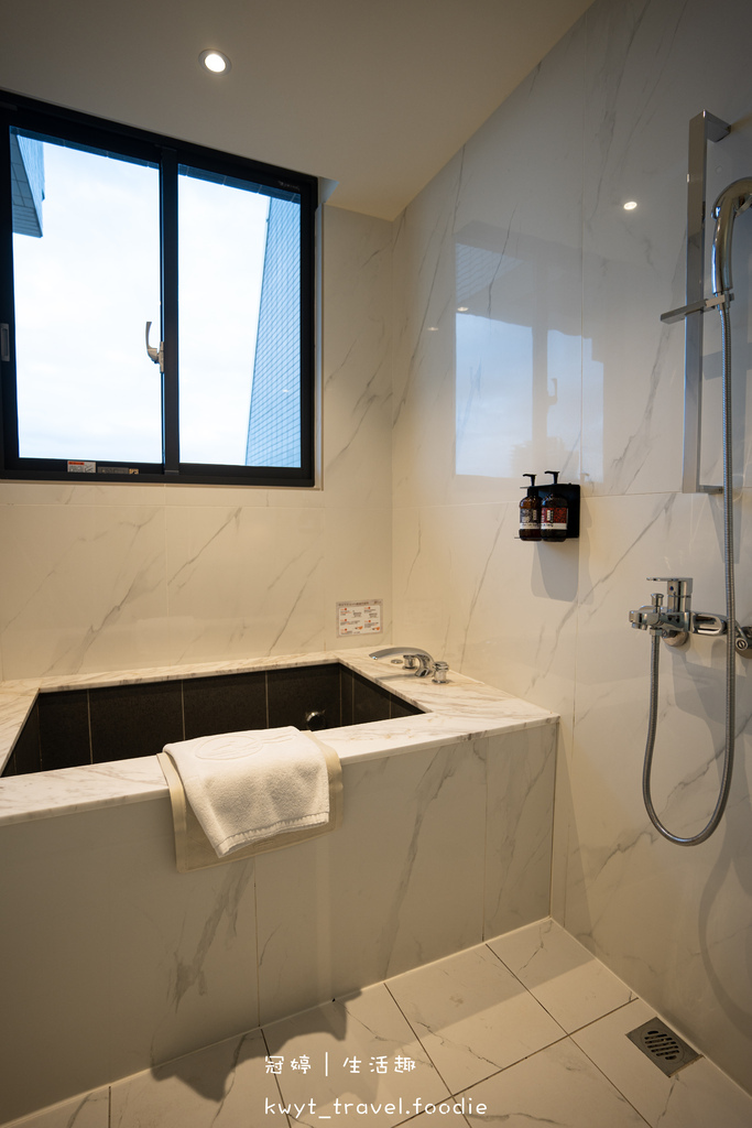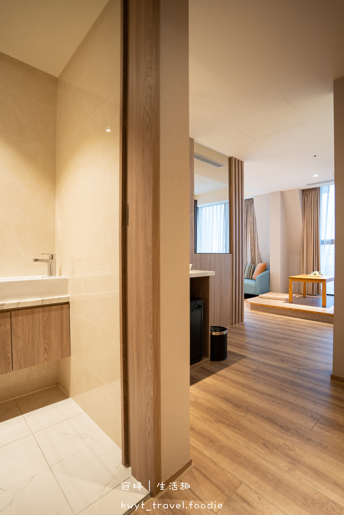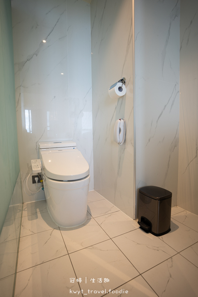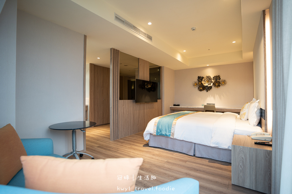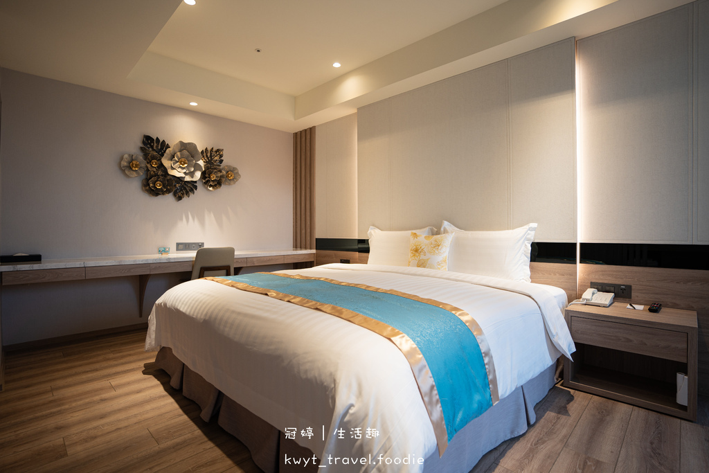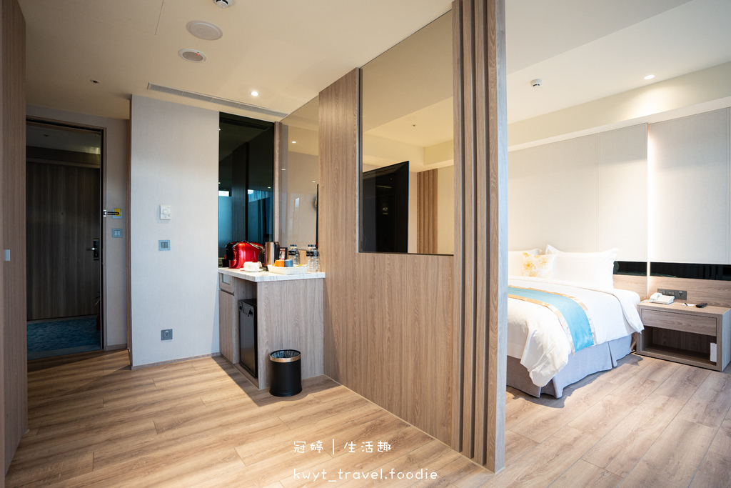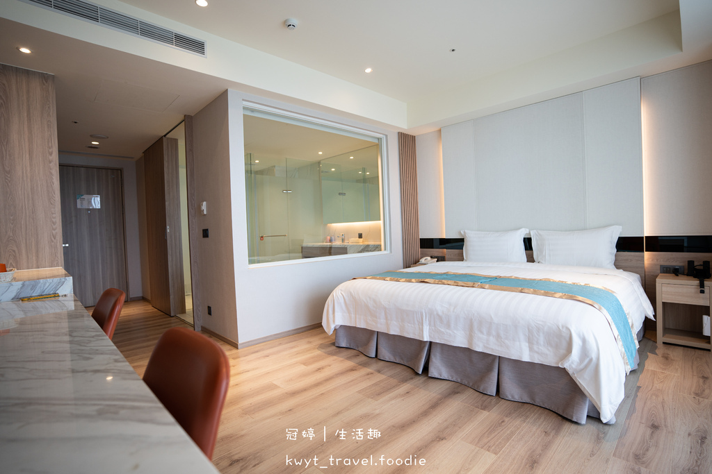 精緻客房為一大床,搭配乾濕分離淋浴間(浴缸設有新科技奈米浴)、獨立廁所(設有免治馬桶),與景觀陽台。