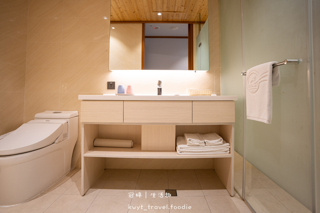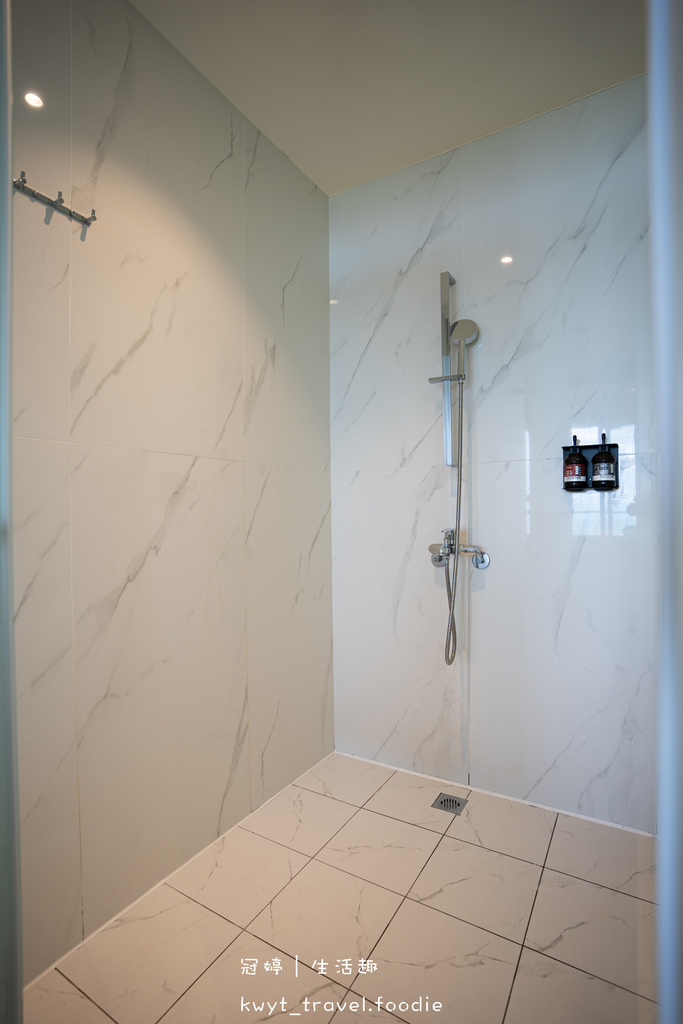淋浴間內備有宜蘭在地品牌-茶籽堂洗髮乳、沐浴乳,在不容易被水淋濕的區域貼心設計了毛巾架可晾掛。