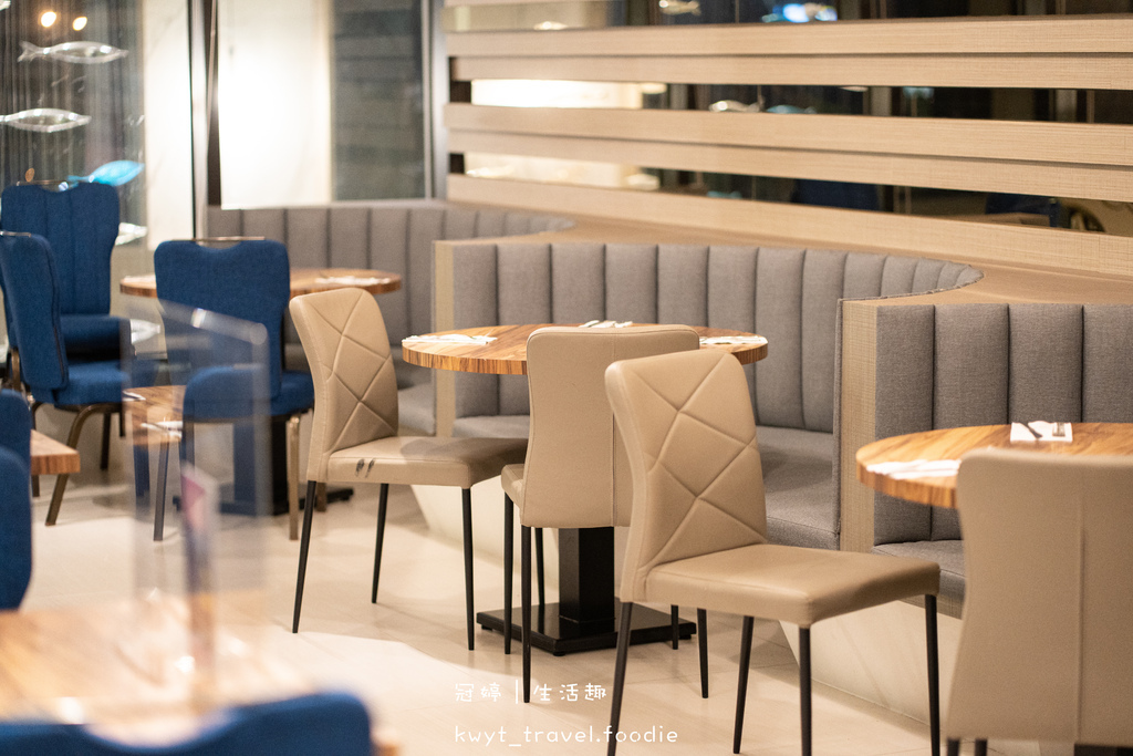 用餐座位設有2人桌、4人桌、6人桌、8人桌等座位,在以柔和燈光點亮的空間裡擺放著質感桌子與作感舒適的椅子呈現。