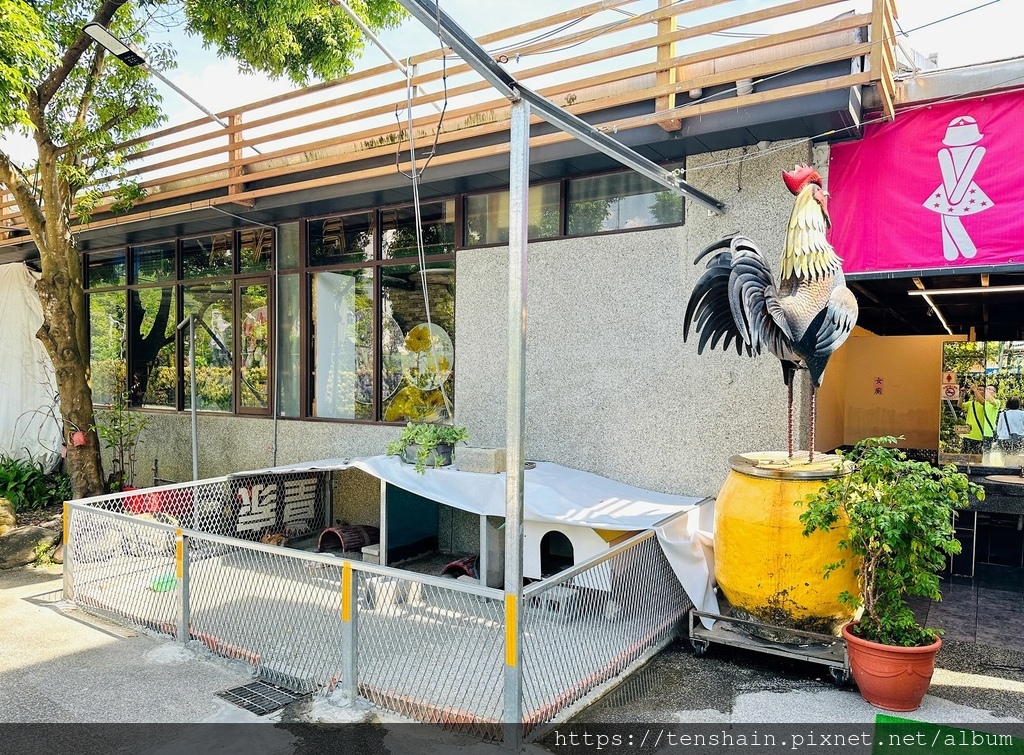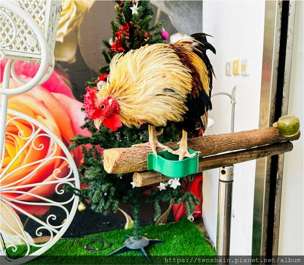 拍完美照進餐廳之前,請記得跟店長打個招呼,店長就是站在鳥踏台上展翅高歌的"公雞先生"。這隻公雞非常神奇,完全沒有繫繩,就這樣站在鳥踏台上迎接所有賓客,一點疫態都沒有,超厲害!