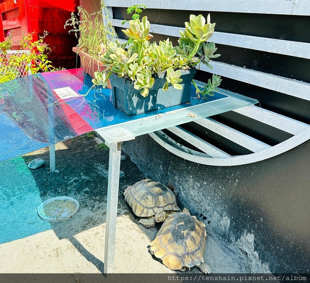 收音機下面暗藏玄機,仔細看,遮陽棚下有兩隻陸龜,大的叫"紐紐",小的叫"紅龜桂"。可惜沒有介紹名字的緣由,因為我覺得"妞妞"比"紐紐"更順口好叫,所以很好奇"紐紐"這個名字的由來。