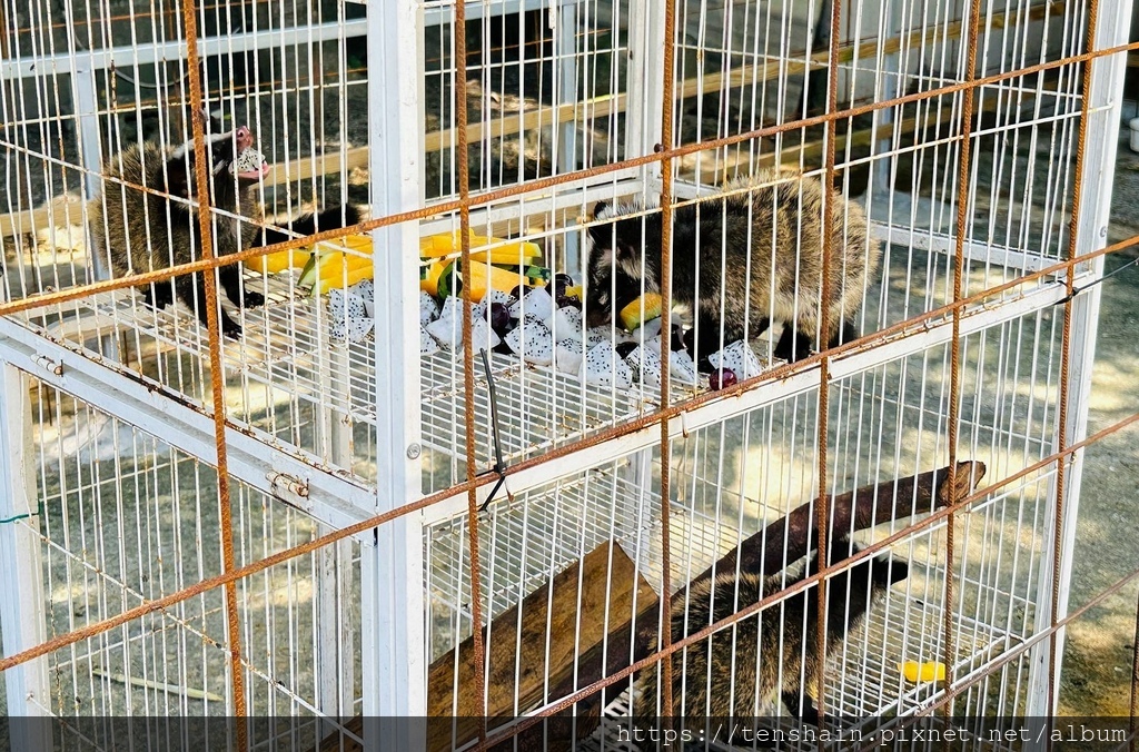 籠子裡有三隻被母親棄養之後,才被餐廳收養的果子狸,我們幸運地看到精彩的餵食秀。原本看起來無精打采的果子狸,看到新鮮的水果大餐,立刻精神抖擻的狼吞虎嚥,吃得不亦樂乎!