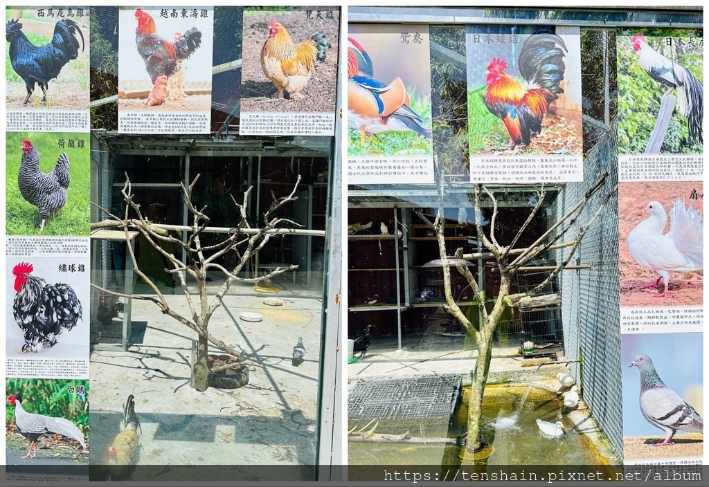 大型鳥籠裡面的動物有"鴛鴦、日本矮雞、日本長尾雞、扇尾鴿、原鴿、西馬尼烏雞、越南東濤雞、梵天雞、荷蘭雞、繡球雞",種類繁多。