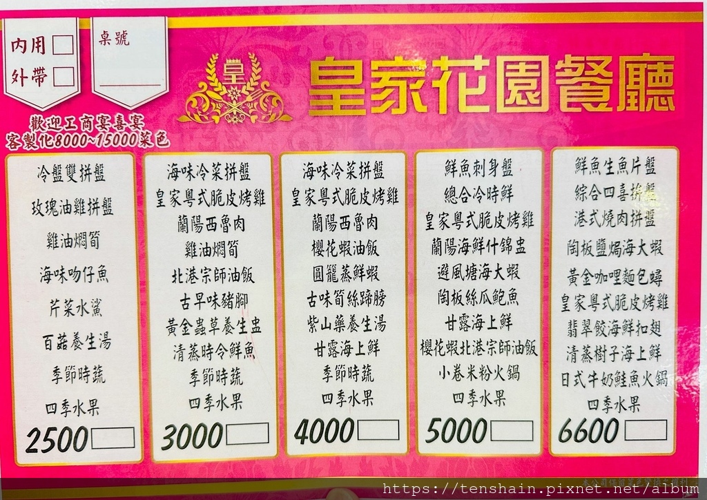 若是人多,可以考慮點搭配好的桌菜,從 2500 元到 6600 元,豐儉由人。