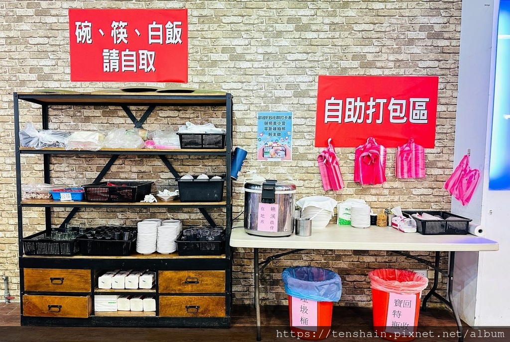 碗筷要自取,白飯使用礁溪農會的在地米,可以無限吃到飽。還有自助打包區,吃不完帶回家,一點也不浪費,設想真周到。