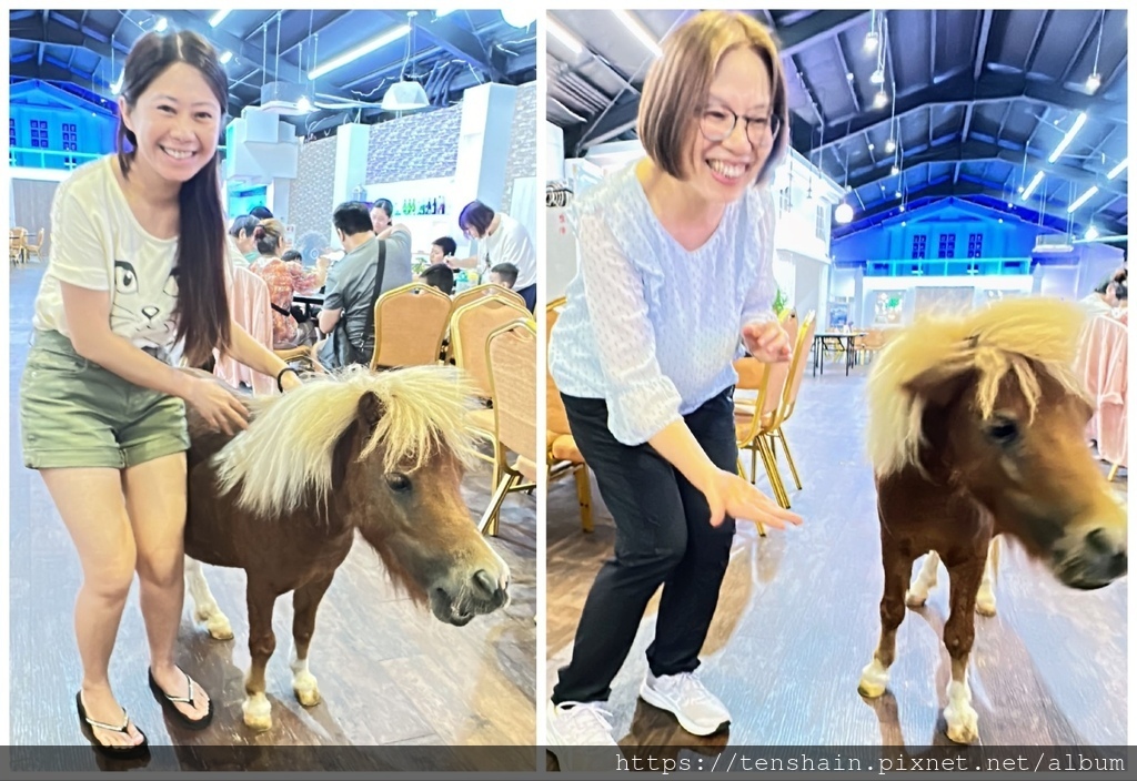 女兒從小就很愛動物,雖然現在已經長大,但是童心未泯,只要看到可愛的動物,就會興奮莫名!「皇家花園餐廳」養了兩隻非常可愛又聰明的迷你馬,紅色毛髮的叫"小愛",黑白相間的叫"小寶"。兩隻迷你馬都很馴良,完全不懼生人,拍照打卡來者不拒,絕對會謀殺你手機上大量的記憶體。相較起來,"小寶"比較文靜,"小愛"則是「皇家花園餐廳」的明星,非常活潑黏人!