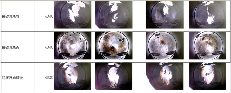 上圖第一列是使用 400cc 紅線PEA 汽油精後的積碳量,第二列再度使用泡沫清潔劑清除積碳,第三列,為改PCV 外排後跑 5000km最後 600~700km 使用約 400km紅線PEA汽油精後的積碳量