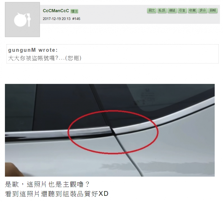 gungunM wrote:前面網友都PO出CX5...(恕刪) 嘿啊,CX5組裝品質很爛,就如同大大說的是五門轎車不是SUV,IIHS亂規類都是草包,我認同啊幫補充柴油還會噴噴,爆檔,送烤還很容易烤色不均呦。XD歡迎PO文呦,對我沒品牌忠誠和喜好的人,說負面的還真的沒啥差。你要當我故意我也沒辦法。隨你意嚕haha有些人自己車被批就天崩地裂,剛好我不同,事實皆可批,反正賣車也沒給我分紅XD