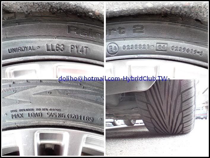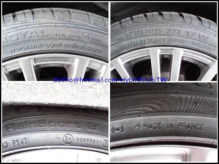 原先原廠:米其林Primacy HP 195/55/16 德國製(這胎也很讚了,光這產地跟型號,在TOYOTA原廠配胎中c/p值算很高了)新胎:UniRoyal RainSport 2 215/45/17 (歐洲雨胎之王,強調排水性,胎也很輕)感覺還不錯!供參考