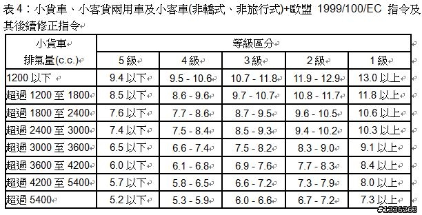 wessley wrote:[耗能標準」- [油耗測試值] = A「能源效率等級]A <1 = 5 級A >1,A <2 之間 4 級A >2,A <3 之間 3 級A >3,A <4 之間 2 級A >4,A <5 之間 1 級這麼簡單的數學....怎沒人看出來 唔,不好意思,想請問一下,是[油耗測試值] - [耗能標準」嗎?不然我怎麼減都是都是負值耶~>_<好像有些也不是這樣的算法,像PORSCHE 911 CARRERA 的耗能標準8.0 ,油耗測試值10.4,相差了2.4,但能源效率等級是2 @@?好困惑~~~~