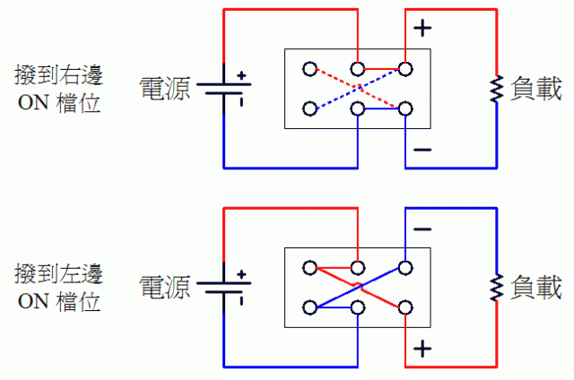 大家好,小弟的愛車後視鏡原本沒有電動收折的功能,最近心血來潮,想改成有電折的,目前,鏡片的上下左右我想使用原本的線路就可以了,麻煩的是控制電動收折的兩條線該用什麼開關來控制,我從車頂室內燈拉了一正一負兩條電線來檢查[開]及[收]是如何作動的,測試結果,只要將正/負兩極交換即可達到[開]/[收]的功能,所以想請問一下,市面上有買 [正負交換的開關]嗎?謝謝!!