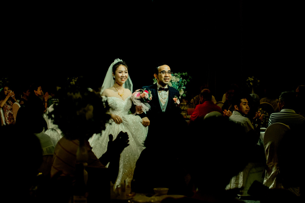 踩著結婚進行曲的節奏緩緩從門口步行而入,新郎臉上是油然而生、娶到美嬌娘的幸福感;新娘提著華美的白紗裙襬,臉上亦是洋溢著甜蜜笑容