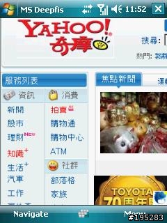 補充說明,和deepfish具有相同"略圖"功能的opera mini,執行奇摩首頁時看起來就樣下圖,十分清楚,要進一步詳看細部資訊,只要輕輕一點畫面自動放大。比如說想看左圖的右下角資訊,點一下之後畫面就會變成右圖那樣(pc檢視模式)^^"