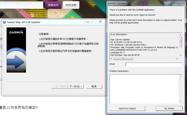 後來因為自己手賤惡搞,將我的3560的.System檔案全毀,機台開起來無文字顯示,無地圖,連更新軟體、更新地圖都會出現這樣的錯誤訊息,於是將3595的.System抄入才救回來,然後更新軟體竟然奇蹟式的好了,後來再嘗試退版、更新,地圖更新都沒問題。