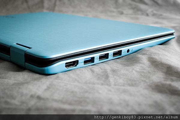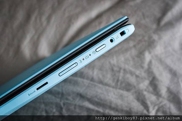 機身左側有豐富的連接埠,耳麥孔、兩個USB2.0、一個USB3.0更難得的是在這種小尺寸二合一機種上居然有全尺寸的HDMI!