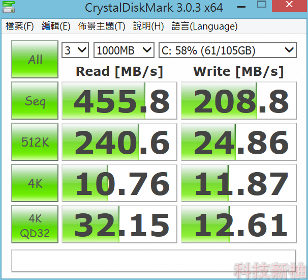 ▲ ASUS T300 Chi 內建 SanDisk iSSD 128GB,使用 CrystalDiskMark 測得讀取每秒 455 MB、寫入每秒 208 MB。
