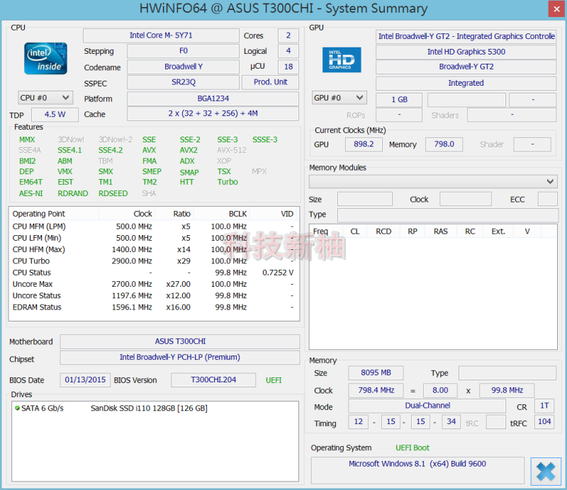 ▲ 這次測試的 ASUS T300 Chi 為 Intel Core M 5Y71、QHD、8GB 版本,GPU 為 Intel HD Graphics 5300。根據 Intel 官方規格,此款處理器為雙核四執行緒,基礎頻率為 1.2GHz,可動態超頻到 2.9 GHz。
