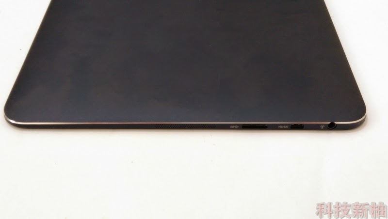 先單獨看平板部份,所有連接埠都在平板上面,而為了厚度不要太厚,都採用了 Micro 規格,像是 Micro HDMI、Micro USB 3.0 OTG、Micro SD 讀卡機等。