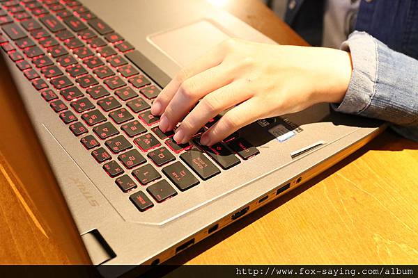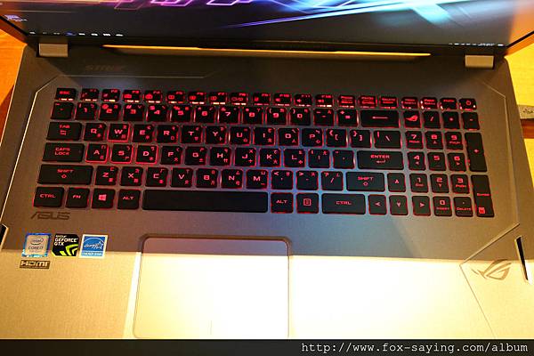 鐵灰色的機身上搭載的是 ROG 粉絲們所熟悉的配色 ~ 黑底紅光 的背光鍵盤