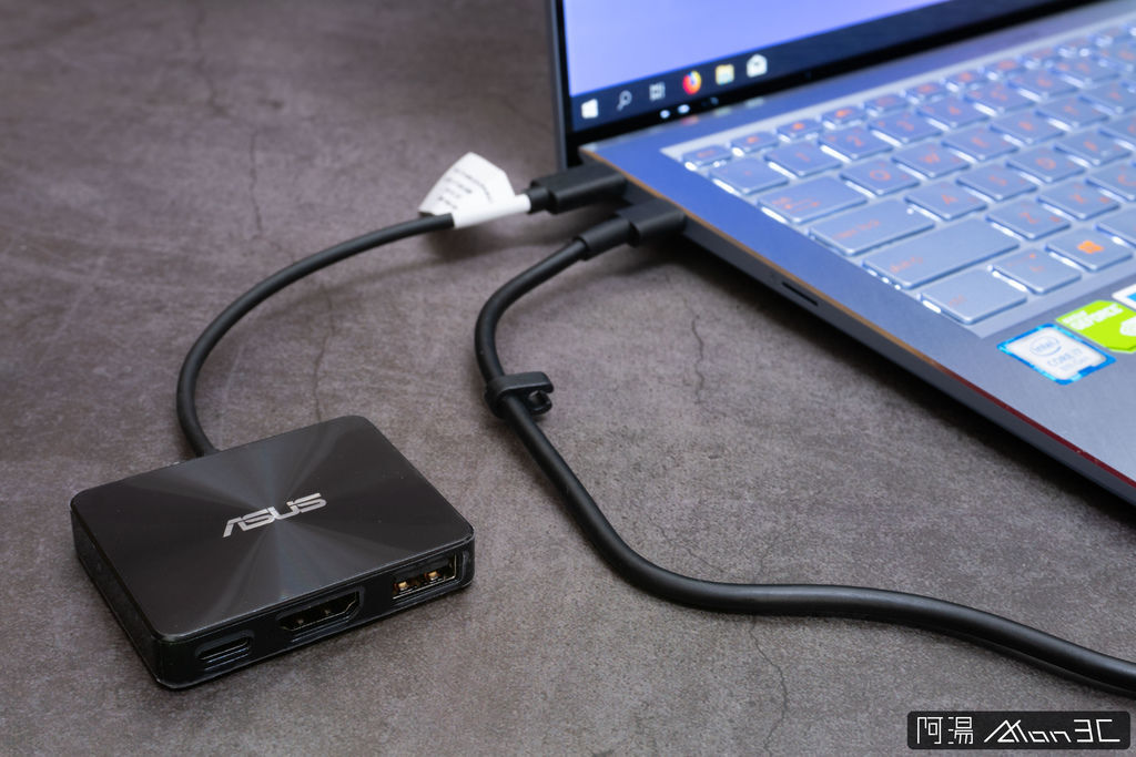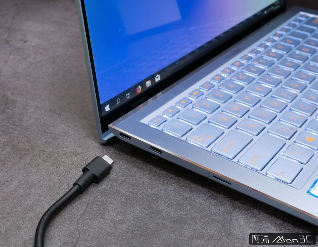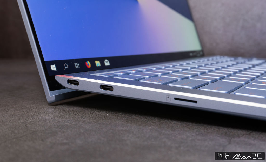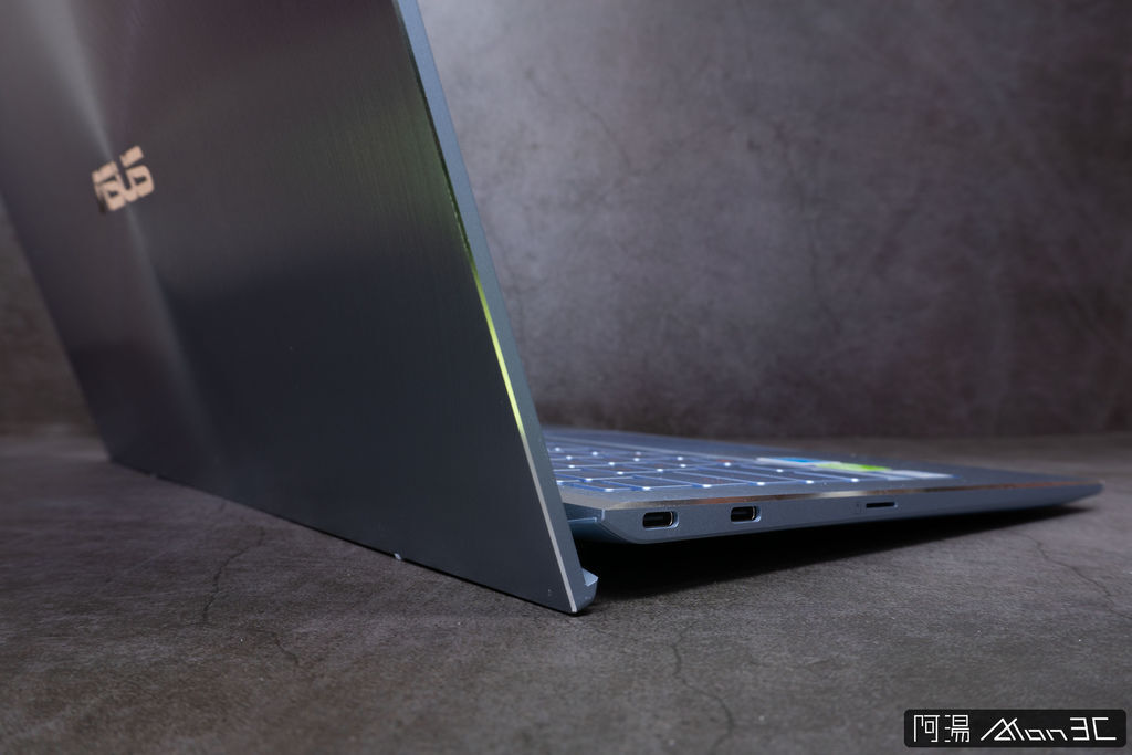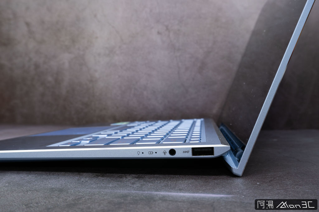 再來說說UX392的連接阜,我的天呀! 竟然有USB Type-A ! 要知道現在一堆極致輕薄型的筆電都把所有的接頭換成了Type-C,而UX392還是佛心的給了Type-A,雖說Type-C的擴充性很高,還可導入PD充電、ThunderBolt,但是你有用過Type-C的滑鼠嗎? 你有在用Type-C隨身碟嗎? 因此華碩選擇留下了一個Type-A接口個人是覺得挺不錯的。