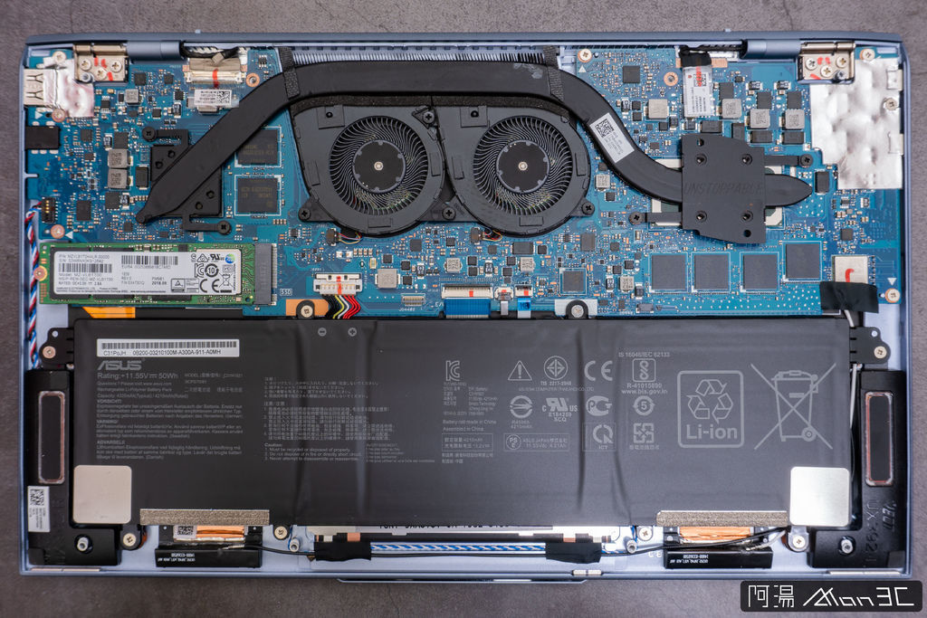 而拆開筆電來看,其散熱系統配備了兩顆小風扇做散熱,一根熱導管連接MX150與i7 8265U,從燒機測試上來看,其散熱系統是夠力的,且運行時,噪音不大。