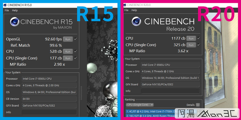 所以先前提到了這台筆電在這輕巧的機身中放入了i7 8265U與MX150,那麼它的性能表現如何呢? 首先來跑個分,CineBench R15與R20分別跑出 單核177 / 多核528分與單核325 / 多核1177分,整體來說還算不錯,以一台這麼薄的筆電來說,能有這樣的性能真的厲害。