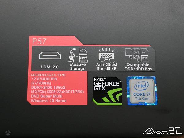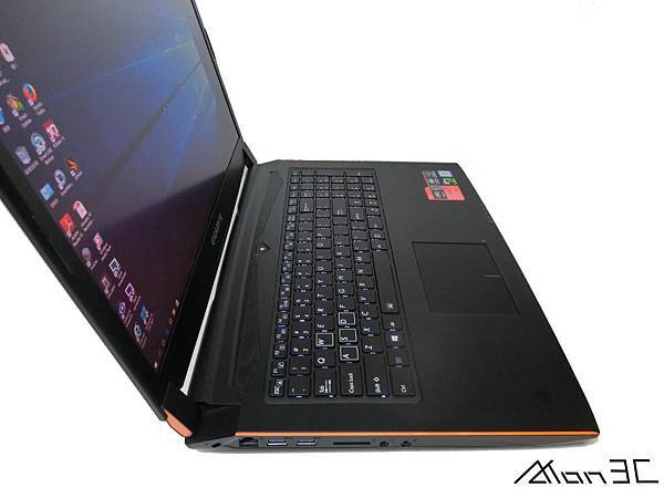 技嘉P57X V7,有著霧面黑的外觀,搭配著一些橘色線條,外型雖低調,但內在卻是貨真價實的電競筆電,搭載著GTX 1070以及Core I7 7700HQ,帶給玩家毫無LAG的遊戲體驗,螢幕方面,有著FHD .2K . 4K等解析度可選擇,本次開箱的P57搭載的是日本夏普的4K高畫質面板,色彩表現相當亮眼,Smart Manager內還可調整螢幕色溫,供媒體/繪圖工作者使用,不過如果是一般的遊戲玩家,想要有高級的遊戲體驗,建議選擇FHD / 2K的面板即可,畢竟1070不是定位在4K解析度特效全開。