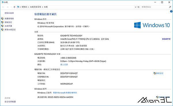技嘉P57X V7使用Windows 10 家用版作業系統,也有 專業版 windows版本可選購