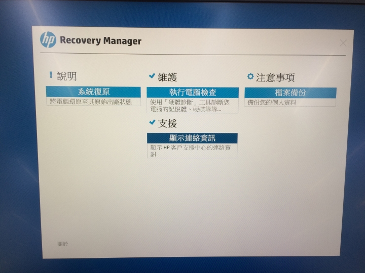 這狀況大部份常會發生在Windows Update後,不知是什麼衝到結果變成讓還原系統亂碼,猜測是有可能更新了UEFI或是Windows 10保留磁區的部份。就我知道的解決方法有1.硬著頭皮給它還原下去,但就是要知道正常的還原步驟才行(待會說明)2.到官網抓該機型驅動的地方,重新安裝 hp recovery manager 這個工具軟體,有時這樣就會修好。有時這軟體可能會寫中文名稱「HP復原管理員」,請自行應變。若剛好遇到HP正在更新這軟體,官網找不到時就只能等HP 更新完重新放上伺服器不過若已進不了系統,只能用還原系統的話,就看下面正常狀況的畫面來對應操作像下面這樣點「系統復原」不備份資料就選第二個,然後按下一步然後要注意的是,若有自己額外切割了硬碟,例如另外切了D:、F:槽,那這種原廠的還原系統有很大的機率會直接全砍掉,變回原出廠切的分割狀態,結果 D:、F:的資料就全沒了的狀況。所以請務必要把硬碟內重要資料都備份好了後再進行還原。不要以為有切其他分割區會就沒事。若還能進系統的話,請直接在系統內做備份,因為我不知道還原系統的備份功能會備份那些資料如果想留其他分割區的資料,請改用Windows 10內建的還原系統,但驅動或原廠的特殊功能軟體就要自行重新下載安裝了,像HP有的機種有硬碟防震的驅動就要另外到官網下載。(我不確定 Windows 10內建的還原系統會不會把原廠的還原系統蓋掉,建議先備份好原廠還原系統再執行)(雙硬碟機型我沒測過,不確定若把資料留在第二個硬碟會不會一起清掉)題外話HP recovery manager 這個工具軟體可以另外把HP的還原系統備份到隨身碟上用32G 隨身碟就可以了,不要超過32G或還原系統建議的容量,因為備份好後隨身碟會被禁止更動,若放太大的就會被浪費掉。而且這過程只能做一次,所以務必確保有接電的狀況。像有些人看原廠還原系統佔了硬碟空間很不爽,也能用這軟體去移除,但我是建議有做個備份就好別移除,好留些救援的後路。