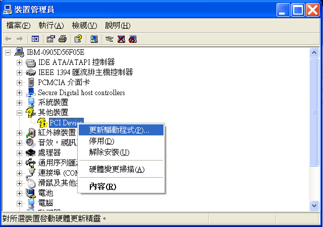 安裝完絕大多數的驅動程式後,網友會發現如左圖所示,裝置管理員會出現一個未知的PCI Device,而且音效裝置及數據機都無法運作。這是因為少裝了「Universal Audio Architecture (UAA) High Definition Audio class driver」,該項驅動程式位於ThinkPad X60-Series主機的 「C:\Drivers\Others3\」目錄下。如果來不及備份的網友,請從下列網址下載: