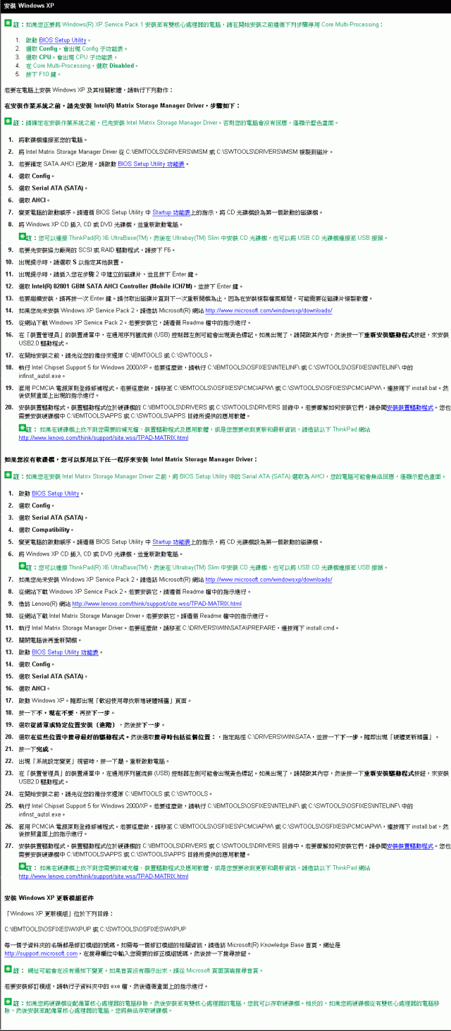由於ThinkPad X60-Series主機提供的Windows XP安裝流程非常詳盡,而且已經翻譯成中文,故站長便轉貼供網友參考。至於安裝流程裡面提到的各項驅動程式,除了直接從X60-Series主機硬碟裡拷貝之外,也可以從下列網址下載,謝謝。